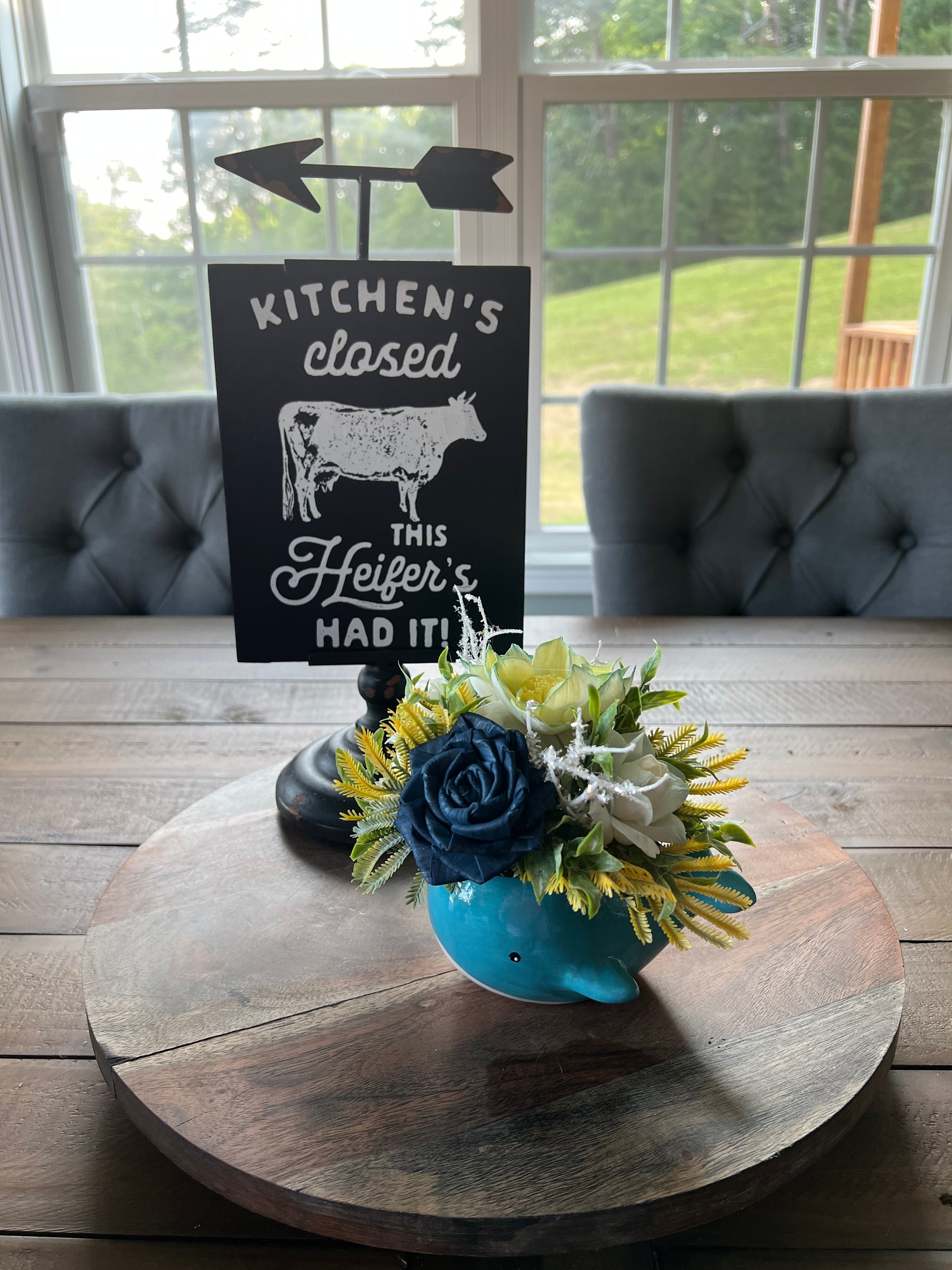 Whale with blue flowers made of wood.